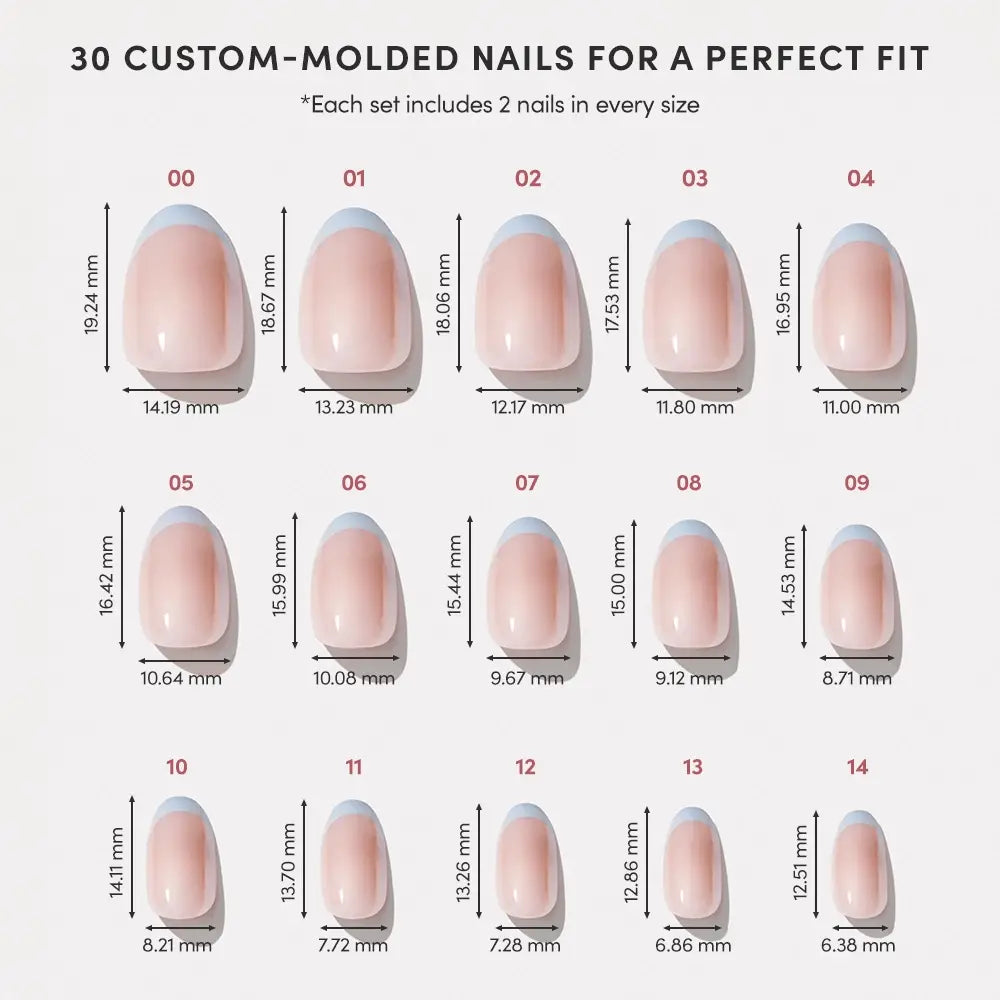 Drift away with the Into Blue Press-On Nail Set. Inspired by calm waters, these short oval nails feature a semi-transparent base and soft periwinkle micro French tips. Finished off with a glistening glaze, these manis deliver long-lasting salon-quality in just 5 minutes.